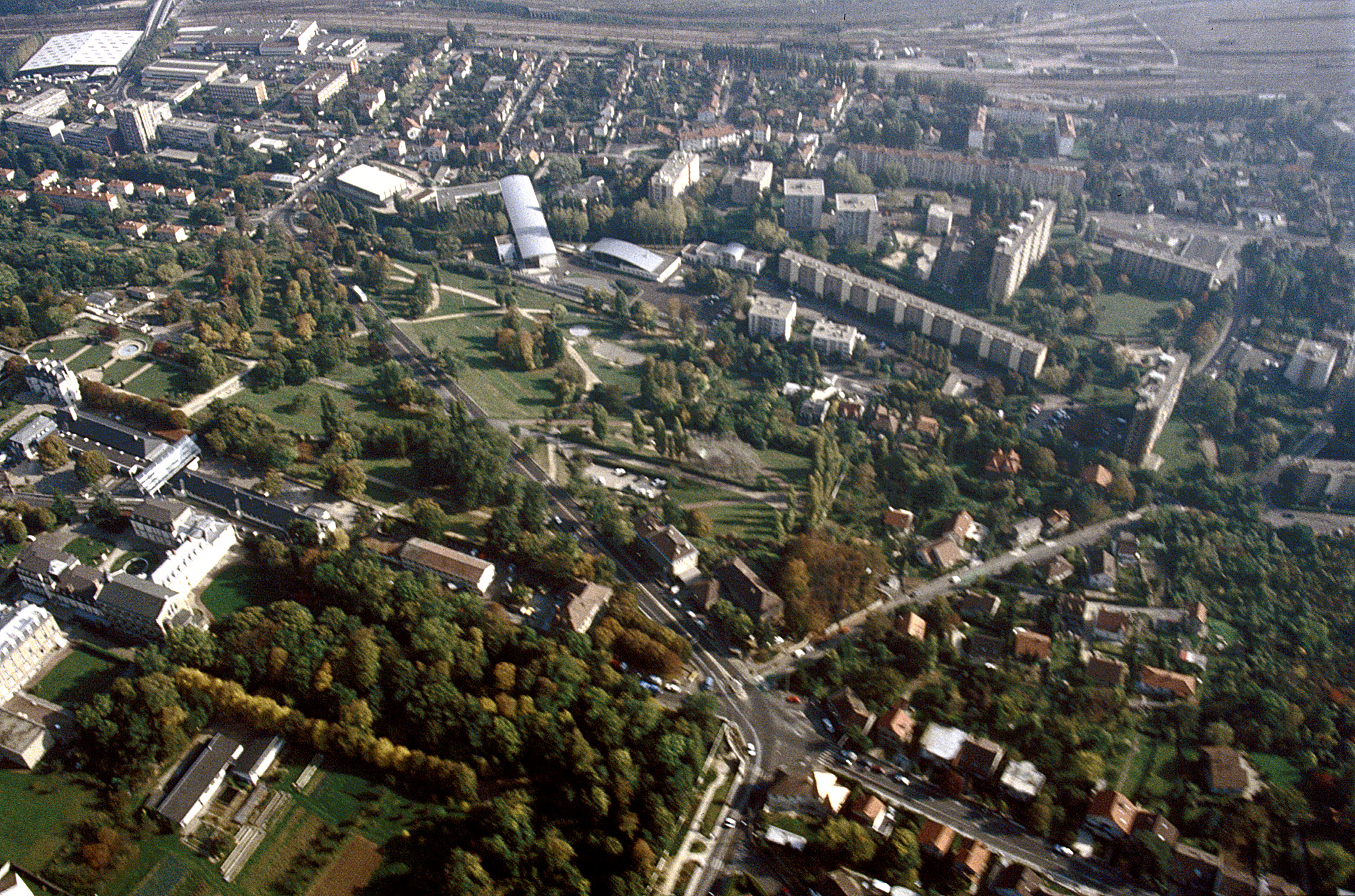 Vue aérienne : château d'Ozonville, mairie, avenue Aristide-Briand et quartier d'Athis-Val à l'arrière-plan ; au fond, immeuble HLM construit par la SNCF et Cité des Fleurs.Immatriculation