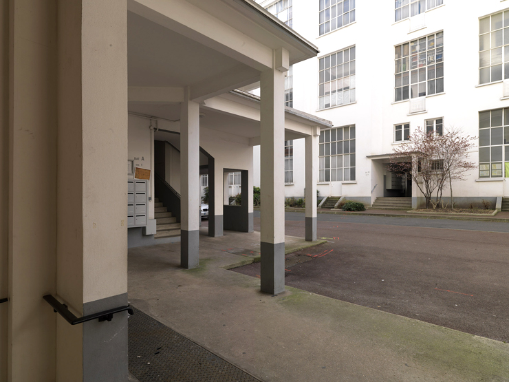 Vue des toits sur pilotis protégeant les accès aux escaliers du bâtiment principalImmatriculation