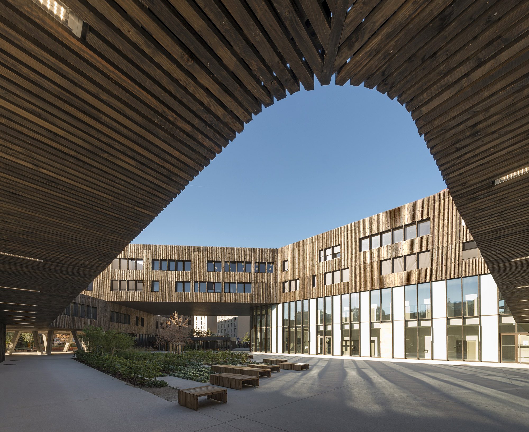 Saint-Denis (Seine-Saint- Denis), lycée La Plaine. Vue sur la cour intérieure. Les parements de bois gris, destinés à se patiner avec le temps, donnent, par leurs variations, une consistance tridimensionnelle aux parois.Immatriculation